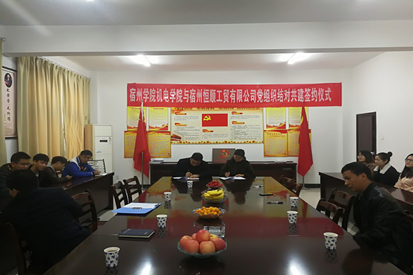 为进一步加强新形势下高校党建工作,深化基层党组织标准化建设,落实基层党组织建设质量提升行动,11月26日上午,best365网页版登录官网学院与宿州恒顺工贸有限公司党组织举行结对共建签约仪式,学院党总支书记刘超、院长郭焕银、党务秘书王艳、学生党支部书记王天涯,宿州恒顺工贸公司党支部书记李玉杰、宿州恒顺工贸公司党支部部分党员代表参加会议。