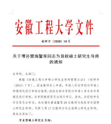 近日,安徽工程大学发布《关于增补曾海鳌等同志为我校硕士研究生导师的通知》校研字〔2020〕10号文件,通过严格评审,我院朱光教授、牛晓飞教授、刘从虎副教授、李明副教授被安徽工程大学聘任为硕士研究生(学术型)导师。