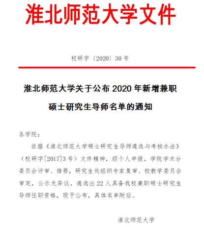 淮北师范大学发布《淮北师范大学关于公布2020年新增兼职硕士研究生导师名单的通知》校研字〔2020〕30号文件,经过严格评审,我院朱光教授被淮北师范大学物理与电子信息学院聘任为硕士研究生(学术型)导师。