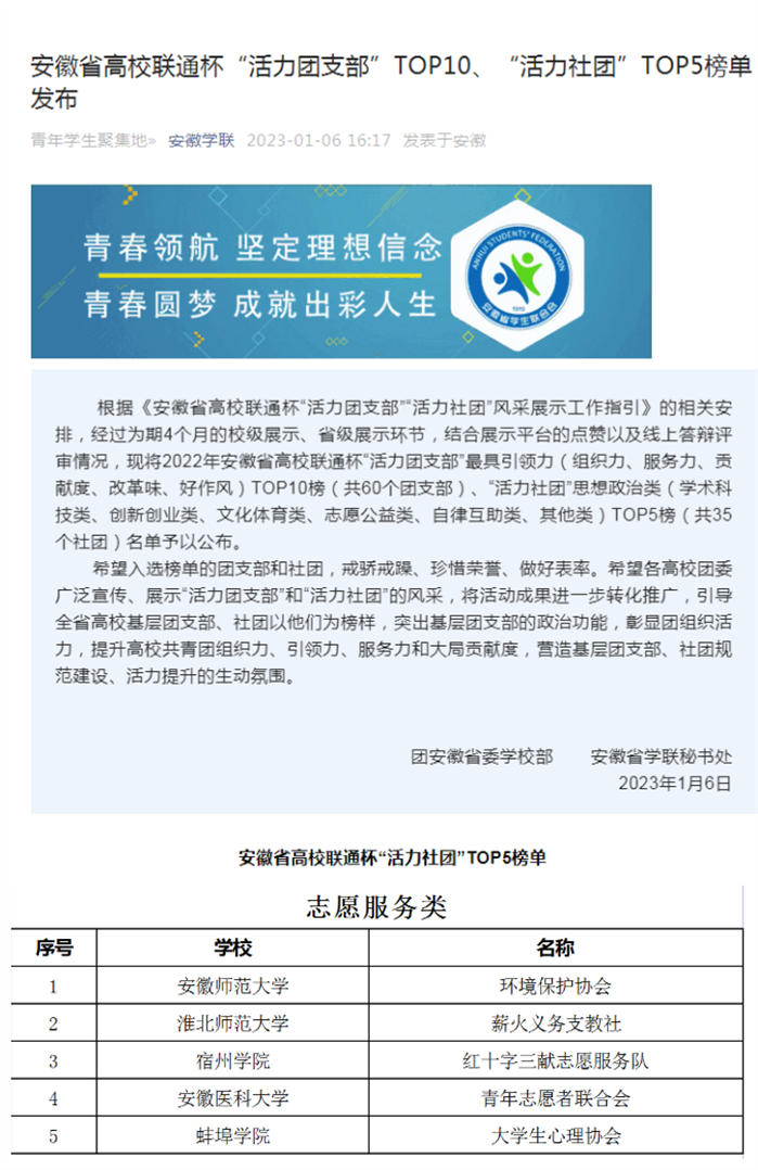 近日,由团安徽省委学校部、安徽省学联秘书处举办的安徽省高校联通杯“活力社团”风采展示活动结果公布,我校best365网页版登录官网红十字三献志愿服务队获评“活力社团”志愿公益类TOP5榜。